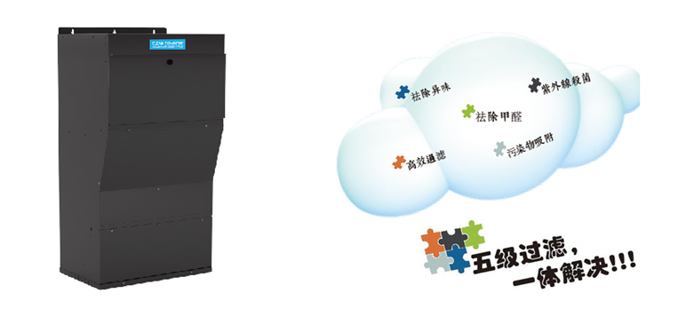 空气中的污染物会通过空调系统的管道带入中央空调内,五级全能净化系统被设计安装在回风管道,这些返回的空气通过系统时进行5步的过滤净化: